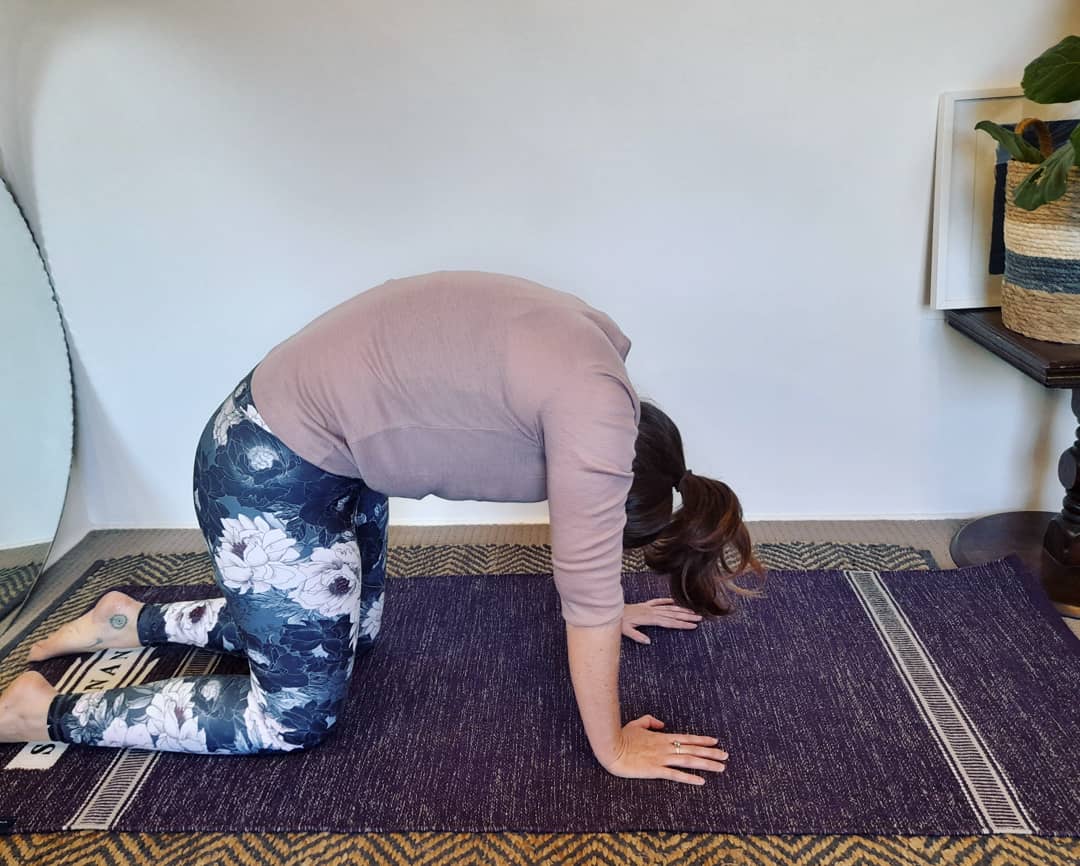 🌿Cat-Cow variation with elbows on the floor and hands clasped. This can help focus on and open the thoracic spine.